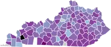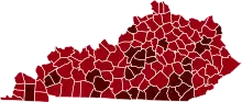 ![]() Map of the outbreak in Kentucky by confirmed total infections per 100,000 people (as of April 8)