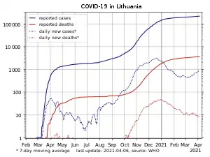 The COVID-19 pandemic in Lithuania is part of the ongoing worldwide pandemic of coronavirus disease 2019 (COVID-19) caused by severe acute respiratory syndrome coronavirus 2 (SARS-CoV-2). The virus was confirmed to have reached Lithuania in February 2020. On 18 March 2020, the first domestic case was confirmed, the first infected being an immediate family member of a known case.[1] The first cases of community spread were found in the country on 19 March and the first related death occurred on 20 March 2020.[2]