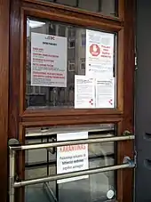 16 March: Two new cases were confirmed. Both patients were in Vilnius, and they had returned from Spain (Barcelona via Paris) and Germany.[36] Later in the day, three more cases were confirmed: one person in Telšiai who returned from the Dominican Republic on 8 March, and two people in Vilnius who returned from Austria.[37] Also on the same day, Lithuania was put under quarantine. All public indoor and outdoor gatherings were prohibited; all shops and businesses excluding grocery shops, pharmacies and veterinary pharmacies were closed; all restaurants and bars were closed, leaving the option for food take-away; borders were closed for foreigners regardless of the means of transport, excluding cargo and special transport; all international outbound passenger travel was prohibited. The quarantine was set to last until 30 March.[32] Lithuanian Railways also halted all international rail services for the duration of the lockdown.[38]