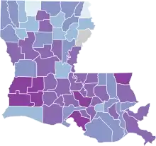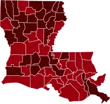 ![]() Map of the outbreak in Louisiana by confirmed total infections per 100,000 people (as of April 7)