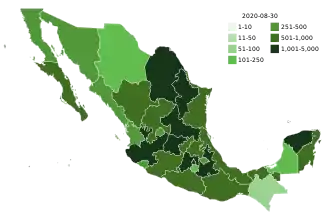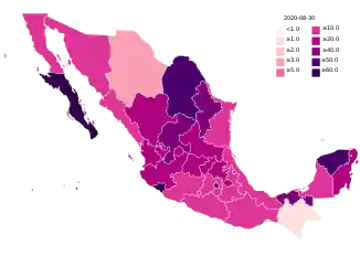 On September 9, Coahuila passed 1,500 deaths; 13,367 people have been released from hospitals.[95] Arturo Herrera Gutiérrez (SHCP) reports that 440,000 industrial jobs have returned after closings earlier this year.[96] Reuters reports that Landsteiner Scientific pharmacies will receive 32 million doses of the Russian-made vaccine in November.[97] Switzerland removes Mexico from the list of countries with a high rate of infection.[98] Six former Health Secretaries release a report critical of the government's response to the virus, saying that increased testing and mapping of cases could lead to containing infections in six to eight weeks.[99] Pemex became the company with the most COVID-19 deaths in the world, with 313. The state-owned oil company also reported 8,166 cases, of which 78.3% have recuperated. The numbers do not include retired workers or families of workers, whose 583 cases have resulted in 413 deaths.[100]
