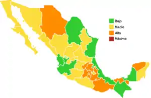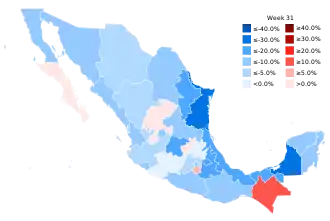 ![]() Map of the outbreak in Mexico by increase or decrease of confirmed new infections per week (as of August 11; week 31) | |