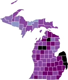 ![]() Map of the outbreak in Michigan by confirmed new infections per 100,000 people (14 days preceding April 8)