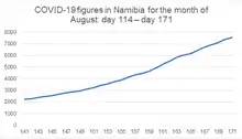 The first day of August brought about 95 new cases. Most originated from Erongo region, however 6 originated from Okahandja in the Otjozondjupa region; a region previously with few cases.[80] On 4 August, total COVID-19 cases rose to 2,470. Most of these were from Walvis Bay, however a growing number originated from Windhoek as well.[81]