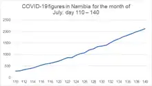 On 22 July the total COVID-19 cases rose to 1,402 when 36 new cases were announced. 32 were from Erongo region, 3 in Windhoek and 1 in Luderitz.[71]