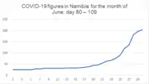 On the last day of June, 9 new cases were reported by the Health Ministry. 8 were from Walvis Bay and the other from Oshana region. 5 were contacts of confirmed cases and 6 patients presented with symptoms when they were swopped.[46][47] By the end of June, cases stood at 205 cases altogether.