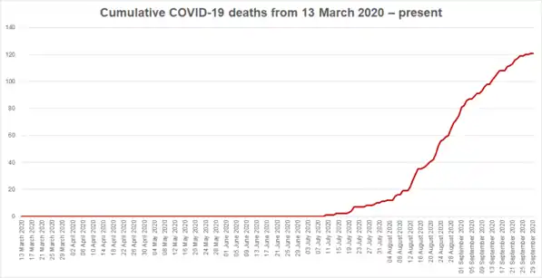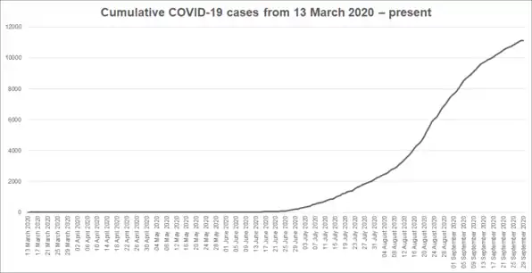 As of September 2020, Namibia was within the top 18 number of countries with the most COVID-19 cases reported in Africa. Although Erongo lead with the most cases and deaths, Khomas region started to experience a community outbreak and numbers rose exponentially to match that of Erongo. In mid-September, most restrictions were lifted after a significant decrease in daily cases.