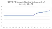 Cases rose to 25 on 1 June when a health care worker, who travelled to South Africa, came back and tested positive upon her arrival in quarantine. The Romanian couple, who were the first two cases in Namibia, has recovered 79 days after their initial diagnosis.[1]