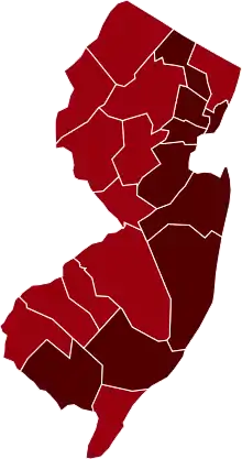 ![]() Map of the outbreak in New Jersey by confirmed new infections per 100,000 people (14 days preceding April 8)