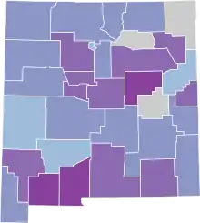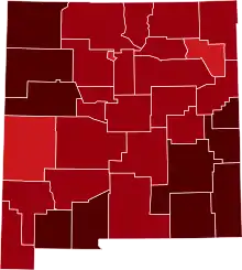 ![]() Map of the outbreak in New Mexico by confirmed total infections per 100,000 people (as of April 8)