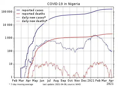 The COVID-19 pandemic in Nigeria is part of the worldwide pandemic of coronavirus disease 2019 (COVID-19) caused by severe acute respiratory syndrome coronavirus 2 (SARS-CoV-2). The first confirmed case in Nigeria was announced on 27 February 2020, when an Italian citizen in Lagos tested positive for the virus.[4][5] On 9 March 2020, a second case of the virus was reported in Ewekoro, Ogun State, a Nigerian citizen who had contact with the Italian citizen.[6]