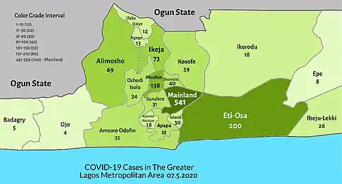 On 29 March, Ekiti State government placed a dusk-to-dawn curfew on the state, closing the state borders and banning inter-state travel from and into the state for 14 days, except vehicles carrying food items, medical, petroleum products and other essential goods from 30 March, while also ordering residents to stay at home, except those on essential services. The government also ordered the closure of all businesses, offices and places of worship.[149] Anambra State government announced the closure of River Niger Bridge with immediate effect, allowing only vehicles transporting food items and medicines.[150] Federal government announced the locking down of Lagos State, Ogun State and the FCT, for a period of two weeks from 11pm on 30 March, ordering the citizens of the affected areas to stay in their homes, banning travel to or from other states and announcing the shutdown of businesses and offices, exempting hospitals, food processing, petroleum distribution, banks, power generation and private security companies. The government also exempted workers in telecommunication companies, broadcasters, print and electronic media staff who couldn't work from home.[151][152] The federal government also suspended the movements of all passenger aircraft all over the country, including commercial and private jets.[153] Osun State government announced the total lockdown of their state from 31 March, banning movement of individuals and inter-state movements, allowing only those on essential duties to operate, such as health personnel, fire service, security personnel, environmental officials, power and water supply agencies, media and telecommunication officers. The state also permitted pharmaceutical and medical outfits to open.[154]