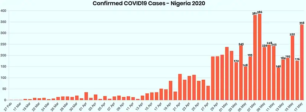 Nigeria recorded its highest daily number of COVID-19 cases on 17 December with 1,145 new infections. The Presidential Task Force said that this increase in cases showed that the country entered the second wave of the pandemic.[33][34][35]