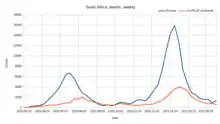 The South African Medical Research Council estimated more than 150 000 excess deaths during the pandemic as of 20 March 2021,[19] with 85-95% of these excess natural deaths attributable to COVID-19, and the remaining 5-15% probably mainly due to overwhelming of the health services.[20]
