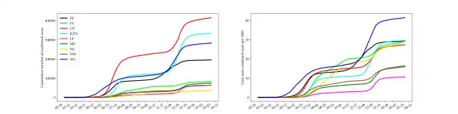 By 23 April, when President Ramaphosa again addressed the nation the total number of cases had increased to 3953. Detailed figures released by the NICD showed that in April that the number of cases had taken distinct trajectories in different provinces.[55] In the two weeks from 9 to 23 April, the cases in the coastal provinces had a very high increase – Eastern Cape cases rose 583% from a low base, KwaZulu-Natal rose 108% and Western Cape 148%. North West (67%) and Gauteng (57%) had high increases, while the other provinces had much lower increases from 6% in the Northern Cape to 23% in Limpopo (all with low absolute numbers – 106 in the Free State and under 30 in each of the other provinces).[56]