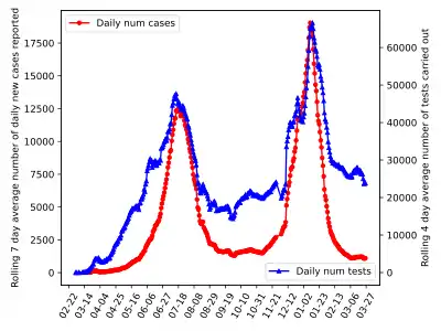 On 9 December, the Minister of Health announced that the country had entered the second wave of infections. The country was now recording over 6000 cases per day from fewer than 1000 cases per day at the end of September. The average proportion of positive COVID-19 tests had risen from 10% to 18%.[15]