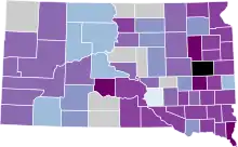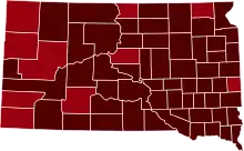 ![]() Map of the outbreak in South Dakota by confirmed total infections per 100,000 people (as of April 8)