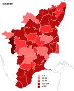 As per the Health Department, 88% of the patients are asymptomatic while 84% of deaths were among those with co-morbidities.[1][2] In June, the state saw a surge in deaths with 209 deaths (36% of the state's recorded deaths) occurring between 11 and 16 June.[3] The initial surge in cases in the state was due to a cluster linked to a Tablighi Jamaat religious congregation event that took place in Delhi, which caused a spike in early April. Another large local cluster in Koyambedu of Chennai was identified in May.[4]