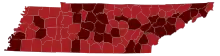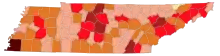 ![]() Map of the outbreak in Tennessee by confirmed total infections per 100,000 people (as of April 8)