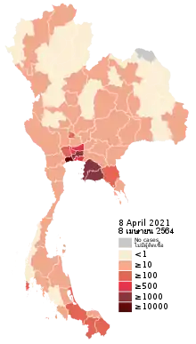 In mid-December, an outbreak occurred in Samut Sakhon, just southwest of Bangkok, increasing the country's total confirmed cases by at least 20%.[47] Cases in the province, which is the center of the country's fishing industry, primarily impacted migrant workers from Myanmar,[47] a major source of labour in the seafood industry.[48] Over 1,300 cases were traced to a seafood market in Samut Sakhon, as cases were detected in 27 provinces.[49] Before the surge, Thailand had recorded about 4,300 COVID-19 cases and just 60 deaths, while Myanmar had registered about 117,000 cases.[48] The 576 cases reported on 20 December was Thailand's biggest daily increase and caused the nation's overall total to climb 13%.[50] A new cluster emerged in Rayong, linked to a gambling den. On 28 December, a worker at the den died, Thailand's first COVID-19 death in nearly two months.[51][52]