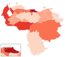The first cases, two on 13 March, were registered in the state of Miranda.[2][3] Colombian president Iván Duque closed the border with Venezuela effective from the next day.[8][9] On 14 March, the official number of cases rose by eight (to ten), and had spread across four states (Miranda, Apure, Aragua and Cojedes).[17] Communication Minister Jorge Rodríguez announced that flights from Panama and the Dominican Republic to the country would be suspended for 30 days, beginning on 15 March.[18]