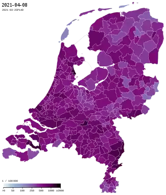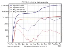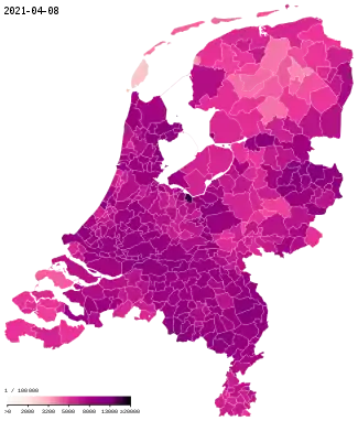 The COVID-19 pandemic in the Netherlands is part of the ongoing pandemic of coronavirus disease 2019 (COVID-19) caused by severe acute respiratory syndrome coronavirus 2 (SARS-CoV-2). The virus was confirmed to have spread to the Netherlands on 27 February 2020, when its first COVID-19 case was confirmed in Tilburg.[3] It involved a 56-year-old Dutchman who had arrived in the Netherlands from Italy, where the COVID-19 pandemic seemed to enter Europe. As of 31 January 2021, there are 978,475 confirmed cases of infections and 13,998 confirmed deaths. The first death occurred on 6 March, when an 86-year-old patient died in Rotterdam.[5]