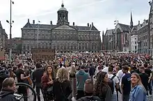 - 1 June: bars and restaurants are allowed to open from 12:00. Inside a maximum of 30 guests are allowed who have to reserve beforehand. On outdoor terraces no maximum is enforced. Both in- and outside guests and personnel have to maintain 1.5 meter distance, unless they are from the same household.[77] On this day there was also a large demonstration on Dam Square in Amsterdam. This was part of the George Floyd protests. About 5,000 people converged on the square. While most of them wore face masks, it was impossible to maintain 1.5 metre distance.[78] The mayor of Amsterdam, Femke Halsema, opted to not stop the demonstration, as she feared riots. She faced harsh criticism afterwards, as this demonstration could cause a new outbreak of COVID-19.[79] However, almost no cases linked to the demonstration (or similar demonstrations in other cities) were found in the weeks after.[80]