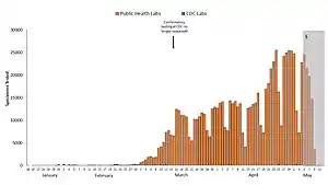 Not shown: Testing at private labs; total exceeded 100,000 per day by 27 March.[121]