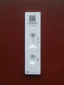 COVID-19 testing involves analyzing samples to assess the current or past presence of SARS-CoV-2. The two main branches detect either the presence of the virus or of antibodies produced in response to infection.[1][2] Molecular tests for viral presence through its molecular components are used to diagnose individual cases and to allow public health authorities to trace and contain outbreaks. Antibody tests (serology immunoassays) instead show whether someone once had the disease.[3] They are less useful for diagnosing current infections because antibodies may not develop for weeks after infection.[4] It is used to assess disease prevalence, which aids the estimation of the infection fatality rate.[5]