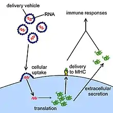 An RNA vaccine contains RNA which, when introduced into a tissue, acts as messenger RNA (mRNA) to cause the cells to build the foreign protein and stimulate an adaptive immune response which teaches the body how to identify and destroy the corresponding pathogen or cancer cells. RNA vaccines often, but not always, use nucleoside-modified messenger RNA. The delivery of mRNA is achieved by a coformulation of the molecule into lipid nanoparticles which protect the RNA strands and help their absorption into the cells.[85][86][87][88]