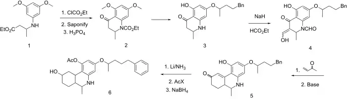Dane salt formation between 3,5-dimethoxyaniline and ethyl acetoacetate followed by borohydrate reduction gives synthon 1. The amino group is protected by rxn with ethyl chloroformate, the ester group is saponified, and then cyclodehydration with polyphosphoric acid leads to the dihydroquinoline ring system (2). Deblocking with HBr is followed by etherification of the nonchelated phenolic hydroxyl gives 3. Treatment with NaH and ethyl formate results in both N-formylation and C-formylation of the active methylene to give 4. Michael addition of methyl vinyl ketone (MVP) followed by successive base treatments to remove the activating C-formyl group and then to complete the Robinson annulation to give 5. Lithium in liquid ammonia reduces the olefinic linkage and successive acetylation and sodium borohydrate reductions complete the synthesis of nantradol (6).