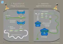 CRISPR (/ˈkrɪspər/) (which is an acronym for clustered regularly interspaced short palindromic repeats) is a family of DNA sequences found in the genomes of prokaryotic organisms such as bacteria and archaea.[2] These sequences are derived from DNA fragments of bacteriophages that had previously infected the prokaryote. They are used to detect and destroy DNA from similar bacteriophages during subsequent infections. Hence these sequences play a key role in the antiviral (i.e. anti-phage) defense system of prokaryotes and provide a form of acquired immunity.[2][3][4][5] CRISPR are found in approximately 50% of sequenced bacterial genomes and nearly 90% of sequenced archaea.[6]