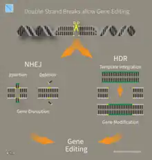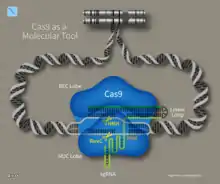 Cas9 (or "CRISPR-associated protein 9") is an enzyme that uses CRISPR sequences as a guide to recognize and cleave specific strands of DNA that are complementary to the CRISPR sequence. Cas9 enzymes together with CRISPR sequences form the basis of a technology known as CRISPR-Cas9 that can be used to edit genes within organisms.[8] This editing process has a wide variety of applications including basic biological research, development of biotechnological products, and treatment of diseases.[9][10] The development of the CRISPR-Cas9 genome editing technique was recognized by the Nobel Prize in Chemistry in 2020 which was awarded to Emmanuelle Charpentier and Jennifer Doudna.[11][12]