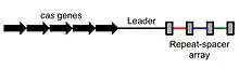 The CRISPR array is made up of an AT-rich leader sequence followed by short repeats that are separated by unique spacers.[74] CRISPR repeats typically range in size from 28 to 37 base pairs (bps), though there can be as few as 23 bp and as many as 55 bp.[75] Some show dyad symmetry, implying the formation of a secondary structure such as a stem-loop ('hairpin') in the RNA, while others are designed to be unstructured. The size of spacers in different CRISPR arrays is typically 32 to 38 bp (range 21 to 72 bp).[75] New spacers can appear rapidly as part of the immune response to phage infection.[76] There are usually fewer than 50 units of the repeat-spacer sequence in a CRISPR array.[75]
