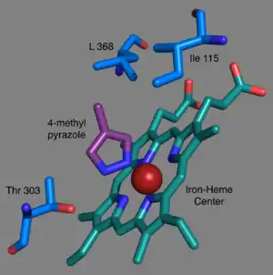 CYP2E1 is inhibited by a variety of small molecules, many of which act competitively. Two such inhibitors, indazole and 4-methylpyrazole, coordinate with the active site's iron atom and were crystallized with recombinant human CYP2E1 in 2008 to give the first true crystal structures of the enzyme.[13] Other inhibitors include diethyldithiocarbamate[20] (in cancer), and disulfiram[21] (in alcoholism).
