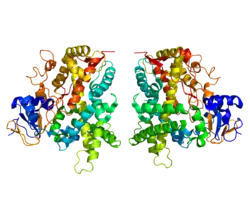 Cytochrome P450 2E1 (abbreviated CYP2E1, EC 1.14.13.n7) is a member of the cytochrome P450 mixed-function oxidase system, which is involved in the metabolism of xenobiotics in the body. This class of enzymes is divided up into a number of subcategories, including CYP1, CYP2, and CYP3, which as a group are largely responsible for the breakdown of foreign compounds in mammals.[5]