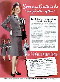 The Eastman Kodak Company sponsored a full-page advertisement in Life magazine (24 January 1944) touting the CNC as a way to serve the country in "a war job with a future". The advertisement said young women who could qualify as cadet nurses were "lucky girls" who were eligible for free training with pay, room and board, and gray uniforms with gray berets. The uniforms were described as one for summer and one for winter, which "you'll wear with pride". Applicants were assured they could wear something "frilly and feminine" instead of uniforms for dances, that they would have time for dating, and that many schools allowed students to marry.[31]
