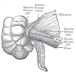 ![]() Superior ileocecal fossa (cecum labeled at bottom left) | |