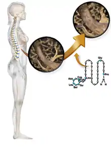 Calcitonin is a 32 amino acid peptide hormone secreted by parafollicular cells (also known as C cells) of the thyroid gland in humans, and in many other animals in the ultimopharyngeal body.[3] It acts to reduce blood calcium (Ca2+), opposing the effects of parathyroid hormone (PTH).[4]