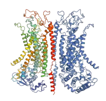 ![]() Cartoon representation of a mTMEM16A chloride channel based on a cryoelectron microscopy reconstruction.[1] | |||||||||