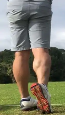 The calf (Latin: sura, plural calves) is the back portion of the lower leg in human anatomy. The muscles within the calf correspond to the posterior compartment of the leg. The two largest muscles within this compartment are known together as the calf muscle and attach to the heel via the Achilles tendon. Several other, smaller muscles attach to the knee, the ankle, and via long tendons to the toes.