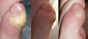 A corn (or clavus, plural clavi) is a specially shaped callus of dead skin that usually occurs on thin or glabrous (hairless and smooth) skin surfaces, especially on the dorsal surface of toes or fingers. They can sometimes occur on the thicker palmar or plantar skin surfaces. Corns form when the pressure point against the skin traces an elliptical or semi-elliptical path during the rubbing motion, the center of which is at the point of pressure, gradually widening. If there is constant stimulation of the tissue producing the corns, even after the corn is surgically removed, the skin may continue to grow as a corn.