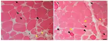 If genetic testing is not available, a muscle biopsy with protein immunoanalysis can be used.[1] Biopsy shows general dystrophic features, such as areas of muscle death, variability in muscle size, nuclei in the center of muscle fibers, and disorganized muscle fibers within muscle cells.[3]