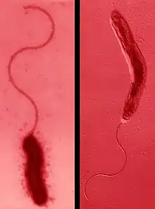 Campylobacter upsaliensis shares the characteristic appearance of other Campylobacter species: it is a curved to spiral, gram-negative rod that displays darting motility.[2][7] The bacterium either have one polar flagellum, or two flagella with one at either end, and can range from 0.2μm to 0.5μm in width and 0.5μm to 8μm in length. When grown on blood agarthe colonies appear smooth, well defined, and grey to translucent.[2] C. upsaliensis is catalase negative, distinguishing it from some other Campylobacter species which are catalase positive.[8] This species is also considered thermotolerant, having been shown to grow in culture at 42 °C, and microaerophilic, generally requiring an oxygen concentration around 5%.[2][9] In addition, C. upsaliensis is oxidase positive, like many other species within the genera.[2][8][10]
