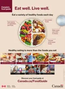 Canada's Food Guide (French: Guide alimentaire canadien) is a nutrition guide produced by Health Canada. In 2007, it was reported to be the second most requested Canadian government publication, behind the Income Tax Forms.[1] The Health Canada website states: "Food guides are basic education tools that are designed to help people follow a healthy diet."
