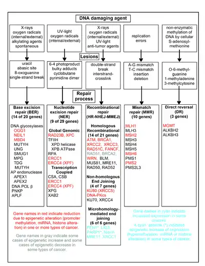 Some of the more well studied genes central to these repair processes are shown in the chart. The gene designations shown in red, gray or cyan indicate genes frequently epigenetically altered in various types of cancers. Wikipedia articles on each of the genes highlighted by red, gray or cyan describe the epigenetic alteration(s) and the cancer(s) in which these epimutations are found. Two broad experimental survey articles[59][60] also document most of these epigenetic DNA repair deficiencies in cancers.