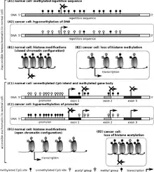 Cancer epigenetics is the study of epigenetic modifications to the DNA of cancer cells that do not involve a change in the nucleotide sequence, but instead involve a change in the way the genetic code is expressed. Epigenetic mechanisms are necessary to maintain normal sequences of tissue specific gene expression and are crucial for normal development.[1] They may be just as important, or even more important, than genetic mutations in a cell's transformation to cancer. The disturbance of epigenetic processes in cancers, can lead to a loss of expression of genes that occurs about 10 times more frequently by transcription silencing (caused by epigenetic promoter hypermethylation of CpG islands) than by mutations. As Vogelstein et al. point out, in a colorectal cancer there are usually about 3 to 6 driver mutations and 33 to 66 hitchhiker or passenger mutations.[2] However, in colon tumors compared to adjacent normal-appearing colonic mucosa, there are about 600 to 800 heavily methylated CpG islands in promoters of genes in the tumors while these CpG islands are not methylated in the adjacent mucosa.[3][4][5] Manipulation of epigenetic alterations holds great promise for cancer prevention, detection, and therapy.[6][7] In different types of cancer, a variety of epigenetic mechanisms can be perturbed, such as silencing of tumor suppressor genes and activation of oncogenes by altered CpG island methylation patterns, histone modifications, and dysregulation of DNA binding proteins. Several medications which have epigenetic impact are now used in several of these diseases.
