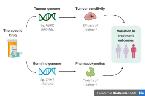 Cancer is a genetic disease where changes to genes can cause cells to grow and divide out of control. Each cancer can have a unique combination of genetic mutations, and even cells within the same tumour may have different genetic changes. In clinical settings, it has commonly been observed that the same types and doses of treatment can result in substantial differences in efficacy and toxicity across patients.[2][3] Thus, the application of pharmacogenomics within the field of cancer can offer key advantages for personalizing cancer therapy, minimizing treatment toxicity, and maximizing treatment efficacy. This can include choosing drugs that target specific mutations within cancer cells, identifying patients at risk for severe toxicity to a drug, and identifying treatments that a patient is most likely to benefit from.[4] Applying pharmacogenomics within cancer has considerable differences compared to other complex diseases, as there are two genomes that need to be considered - the germline and the tumour. The germline genome considers inter-individual inherited genetic variations, and the tumour genome considers any somatic mutations that accrue as a cancer evolves.[5] The accumulation of somatic mutations within the tumour genome represents variation in disease, and plays a major role in understanding how individuals will respond to treatments. Additionally, the germline genome affects toxicity reactions to a specific treatment due to its influence on drug exposure. Specifically, pharmacokinetic genes participate in the inactivation and elimination of active compounds.[6] Therefore, differences within the germline genome should also be considered.[5][7][8]