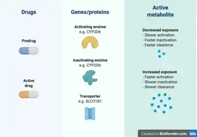 Irinotecan is a prodrug[6] used in the treatment of many solid tumours, including colorectal, pancreatic, and lung cancer.[41] Irinotecan is metabolized into its active compound SN-38, which inhibits the enzyme topoisomerase-1, involved in DNA replication.[42] This active metabolite is inactivated after glucoronidation, mainly performed by UGT1A1.[39] High exposure to SN-38 can result in neutropenia and gastrointestinal toxicity.[6] The decreased activity of UGT1A1 in UGT1A1*28 individuals has been found to increase exposure to the active compound and toxicity.[43][44] For UGT1A1*6, this relationship is more controversial, with some studies finding it can predict irinotecan toxicity while others don’t.[40] Previous prospective studies for assessing the adequate dose of irinotecan in Asians have supported the usage of lower doses in patients with both of UGT1A1*28 and UGT1A1*6.[45][46] The results from these and other pharmacogenomics studies have been translated into clinical guidelines from organizations in USA, Canada, France, The Netherlands, and Europe.[41] All of these institutions recommend a dose reduction in UGT1A1*28 patients.
