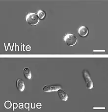 Round, white-phase and elongated, opaque-phase Candida albicans cells: the scale bar is 5 µm